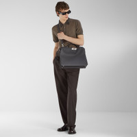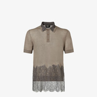 Short-sleeved polo shirt. This style has a classic collar closed with matching-color button. Made of dove gray cashmere yarn, with tone-on-tone lace appliques on the collar and hem. Finished with ribbed edges. Made in Italy Composition: 68% cashmere, 30% silk, 2% polyamide, 55% polyamide, 45% viscose, 4 buttons: mother-of-pearl Size worn: 48 IT. The model is 188 cm tall Product Code: FZC417AOZWF1UCH