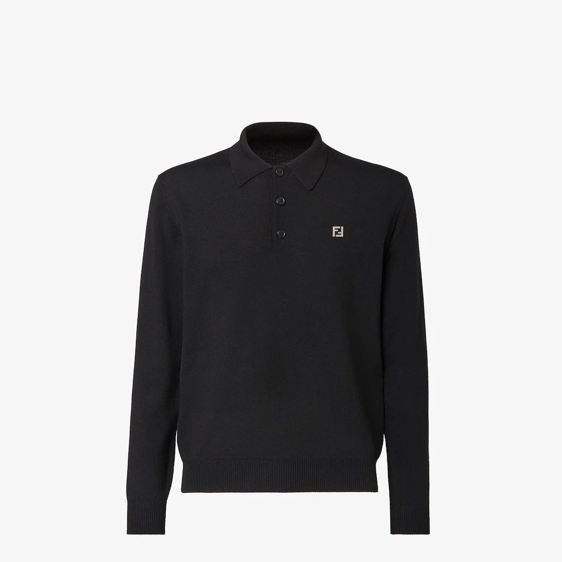Long-sleeved polo shirt. This style has a classic collar with button closure. Made of black, shaved wool knit. Embellished with palladium metal micro FF detail on the chest. Made in Italy Composition: 98% fleece wool, 2% elastane, 1 button: mother-of-pearl Size worn: 48 IT. The model is 188 cm tall Product Code: FZC167AU84F0QA1