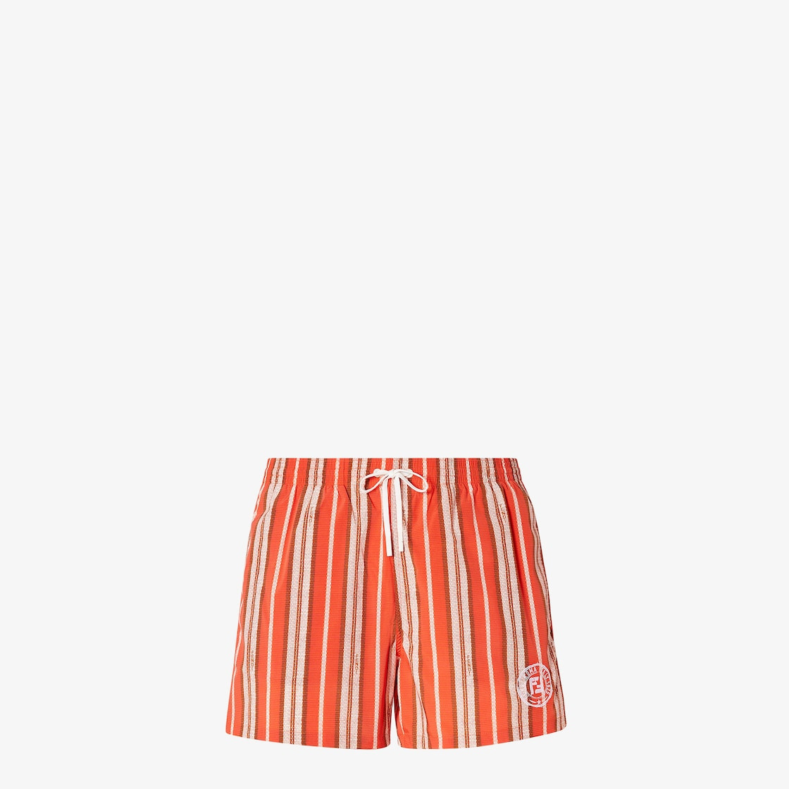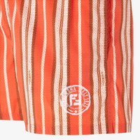 Swim shorts with elastic waistband and drawstring. Made of nylon with vertical stripe motif printed all over in coral and beige. Finished with a contrasting Fendi Postcards logo on the hem. Made in Italy Composition: 92% polyamide, 8% elastane, lining: 100% polyester, embroidery: 100% polyester Size worn: 48 IT. The model is 186 cm tall Product Code: FXB077AV63F1RVD