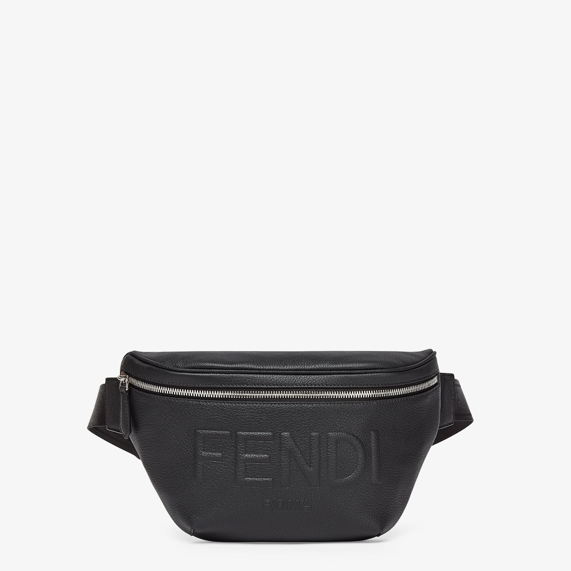 Belt bag made of black full-grain leather, with 3D-effect Fendi Roma logo. Internal compartment with zipper and palladium-finish metalware. Featuring an adjustable technical webbing belt finished with Fendi lettering, to wear on the waist, over the shoulder or cross-body. Made in Italy Measurements: - Height : 18 cm - Depth : 9 cm - Width : 36 cm - Weight : 0.55 kg Composition: 100% calf leather, inside: 63% cotton, 34% polyester, 3% acrylic Product Code: 7VA562AMACF0GXN