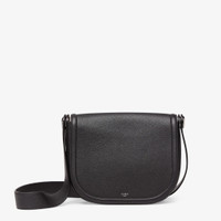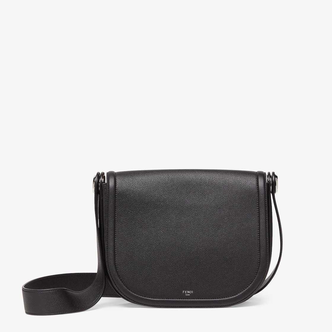Round messenger bag made of black full-grain leather. The design is distinguished by the metal rivet with an engraved FF logo that allows the shoulder strap to be folded under the bag. Flap with small metal Fendi Roma logo and concealed magnetic clasp. Features a contrasting tan-colored leather-lined compartment, two card holder slots and palladium-finish metalware. Tone on tone leather cross-body strap. Made in Italy Measurements: - Height : 25.5 cm - Depth : 6 cm - Width : 29.5 cm - Weight : 0.89 kg Composition: 100% calfskin, inside: 100% calfskin Product Code: 7VA622ARLUF0GXN