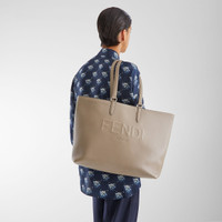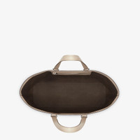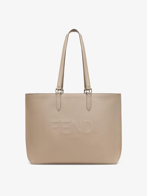 Beige full-grain leather shopping bag with 3D-effect Fendi Roma logo. Spacious internal compartment lined in fabric, with black leather pocket and palladium-finish metalware. Can be carried by hand or over the shoulder thanks to the long double handles. Made in Italy Measurements: - Height : 30 cm - Depth : 15 cm - Width : 40 cm - Weight : 0.9 kg Composition: 100% calf leather, interior: 60% polyamide, 40% polyurethane Product Code: 7VA610ARD9F04Y9