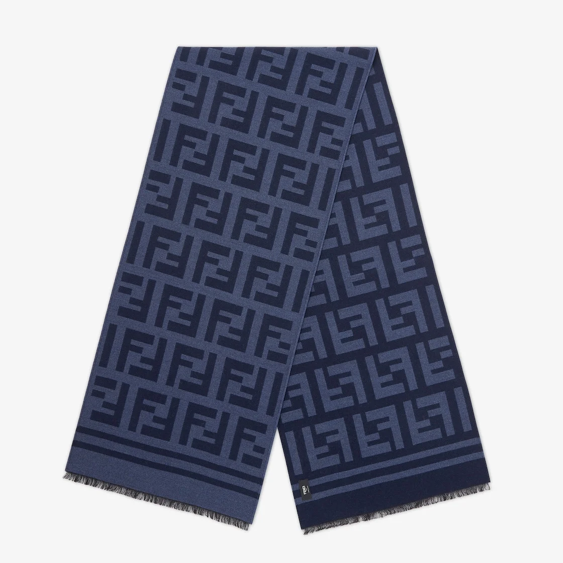 Rectangular scarf made in a wool and silk blend with all-over, oversize FF motif in shades of blue and navy blue. This item is part of the collection curated with designer Stefano Pilati. Finished with fringes at the hem. Made in Italy Composition: 95% wool, 5% silk Product Code: FXS424A3Q1F1E20