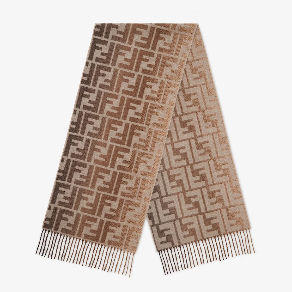 Rectangular scarf made of wool with gradient-effect FF jacquard in beige and brown. Embellished with fringes at the ends. Made in Italy Composition: 90% fleece wool, 10% cashmere Product Code: FXS471ATQCF0QB9