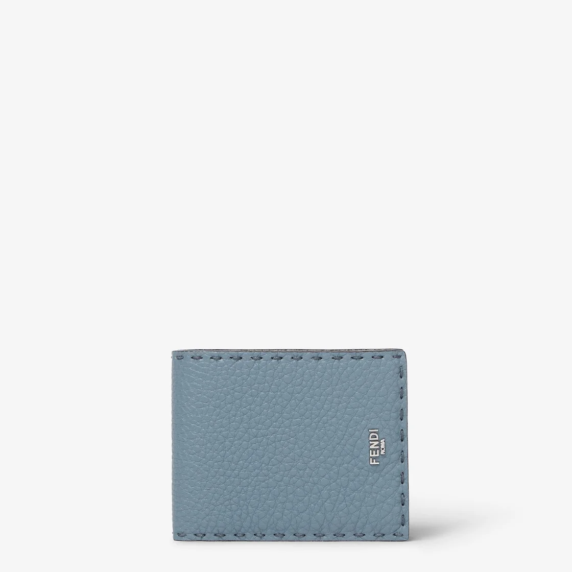 Bi-fold wallet features four card slots, a pocket for bills and a practical coin compartment closed with a snap. Made of Mercury blue Cuoio Romano leather with 132 hand-sewn macro topstitches, an emblem of the iconic Selleria workmanship handed down through generations of Fendi artisans since 1925. Contrasting dark gray leather lining. Metal Fendi Roma logo with a palladium finish. Made in Italy Composition: 100% calf leather, inside: 100% calf leather, 53% cotton, 47% polyurethane Product Code: 7M0194AW2FF1USJ