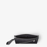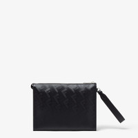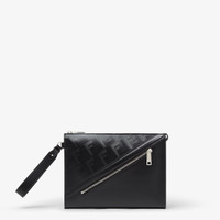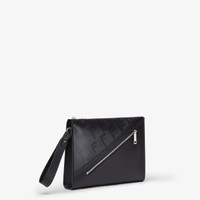 Fendi Shadow black leather clutch bag with a striped texture FF motif. Embellished with a smooth tone-on-tone leather diagonal insert. Outer zipper pocket, zipper closure and palladium-finish metalware. Removable bracelet handle. Made in Italy Measurements: - Height : 20 cm - Depth : 6 cm - Width : 27 cm - Weight : 0.35 kg Composition: 100% calf leather, inside: 63% cotton, 34% polyester, 3% acrylic Product Code: 7VA491AQW1F0GXN