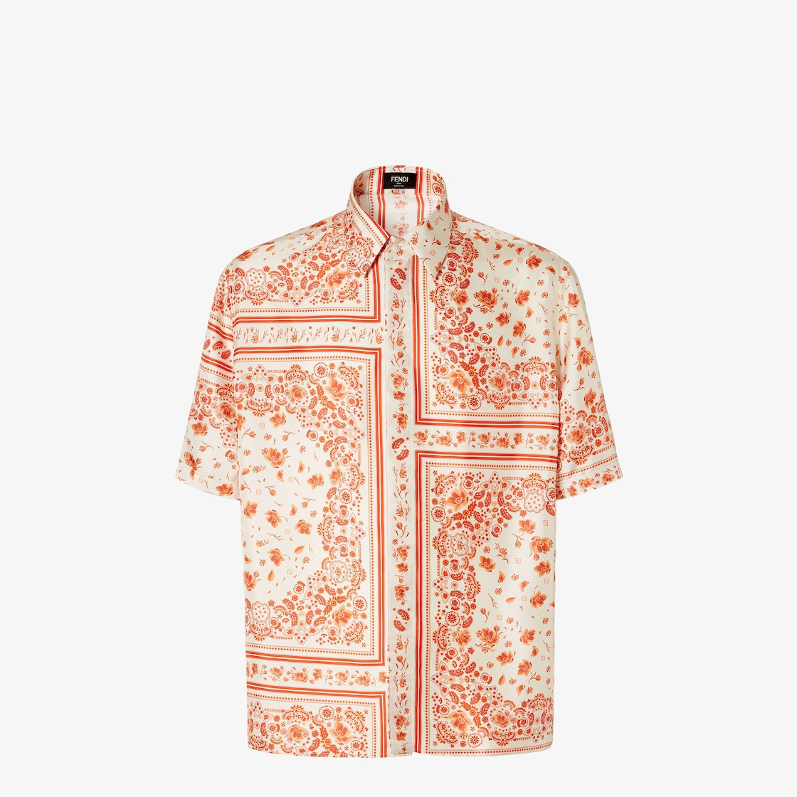 Shirt with Italian-style collar and short sleeves. Regular-fit style. Concealed button fastening. Made of silk with an all-over bandana coral print in white and coral. Made in Italy Composition: 100% silk Size worn: 48 IT. The model is 188 cm tall Product Code: FS0795AUVQF0D4T
