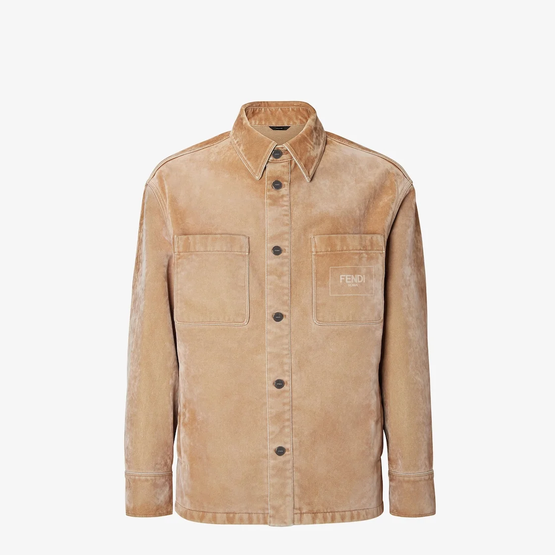 Long-sleeved shirt with dropped shoulders. Patch pockets on the chest. Front closure with metal logo buttons. Made of brown overdyed denim. Contrasting Fendi logo on the left pocket. Palladium-finish metalware. Made in Italy Composition: 100% cotton Size worn: 48 IT. The model is 188 cm tall Product Code: FW1410AT2KF0TZ8