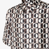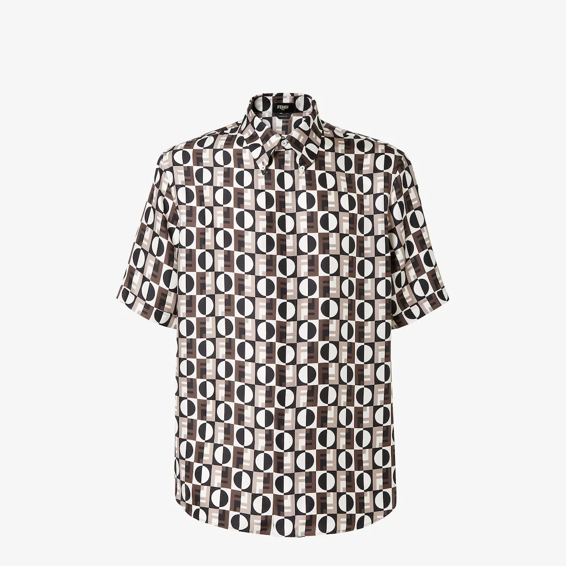 Shirt with button-down collar and short sleeves. Straight cut. Front closure with concealed buttons. Made of silk with a 3D-effect Fendi Optical all-over print in brown, black and white. Made in Italy Composition: 100% silk, 11 buttons: mother-of-pearl Size worn: 48 IT. The model is 188 cm tall Product Code: FS1334AVDMF05AE
