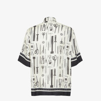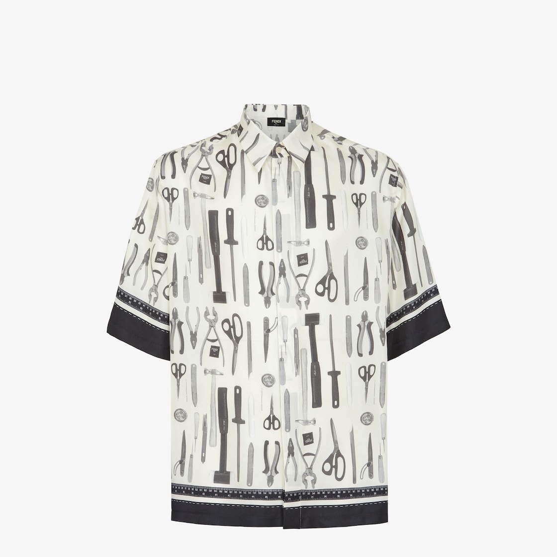 Short-sleeved, oversize shirt. Mid-Italian collar and straight hem. Covered button closure. Made of white pure silk and embellished with a contrasting Fendi Tools print that depicts the Fendi craftsmen’s tools. Finished with black edges at the hem and cuffs. Made in Italy Composition: 100% silk, 100% mother of pearl Product Code: FS0966AR65F1MTG
