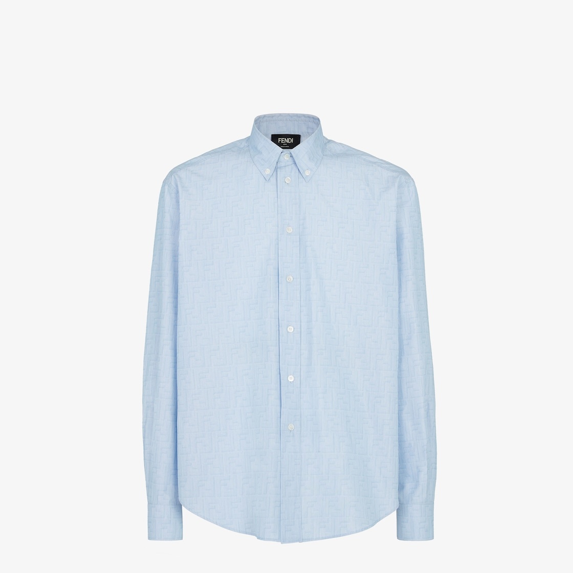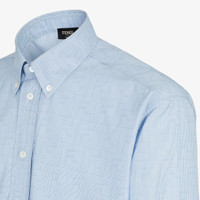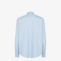 Shirt with polo shirt-style collar. Long sleeves with dropped shoulders and buttoned strap to wear them rolled back. Rounded hem with side slits. Made of FF cotton with fine stripe motif printed all over in light blue. Made in Italy Composition: 100% cotton, 15 buttons: mother of pearl Size worn: 48 IT. The model is 185 cm tall Product Code: FS1308ATM1F0U3X