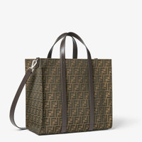 Spacious shopper made of recycled jacquard fabric with FF motif in brown. Features a fabric-lined internal compartment, inner zip pocket and palladium-finish metalware. Can be carried by hand or on the shoulder thanks to the two leather handles and the adjustable, detachable leather shoulder strap. Made in Italy Measurements: - Height : 35 cm - Depth : 19 cm - Width : 41 cm - Weight : 1.2 kg Composition: 62% Polyester, 33% Cotton, 5% Resin, 100% Calfskin, interior: 63% Cotton, 34% Polyester, 3% Acrylic Product Code: 7VA390AG0MF19KW