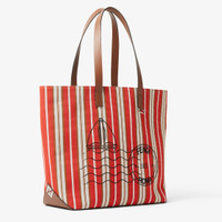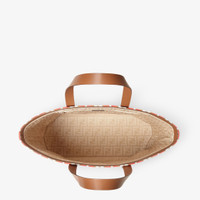Medium shopper bag made of multicolor striped canvas in tones of red with the Fendi Postcards print. Base and details in brown leather. Decorated with FF metal appliques on the corners. Features an internal compartment lined in FF Jacquard, inner zip pocket, ring for charms and palladium-finish metalware. It can be carried by hand or worn on the shoulder thanks to the long leather double handles. Made in Italy Composition: 100% cotton, 100% calf leather, inside: 65% polyester, 35% cotton Product Code: 7VA657AUGUF1SCQ