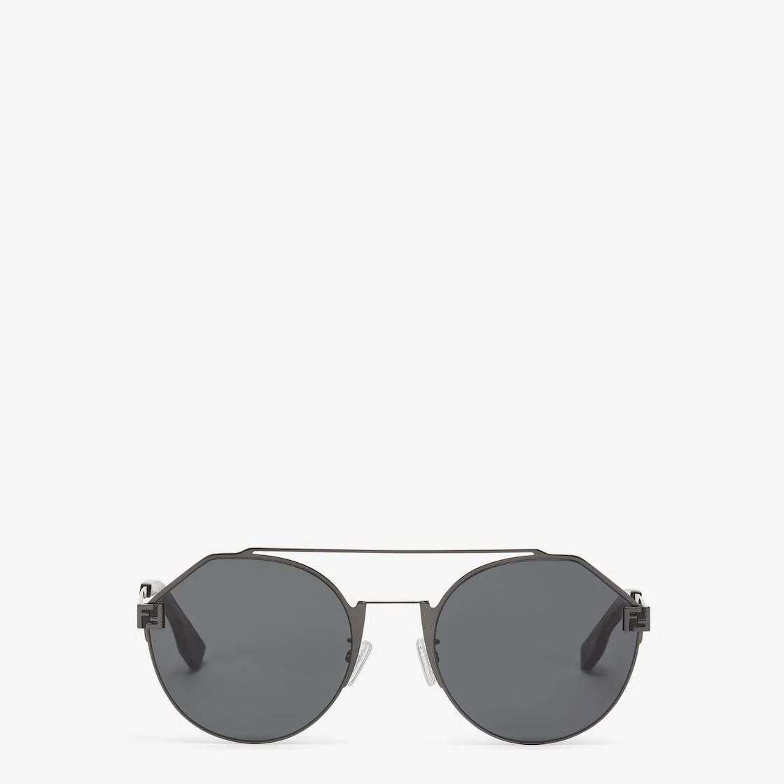 Round, ultra-light sunglasses made of metal with a dark ruthenium finish. Front with a double bridge and metal end pieces customized with the FF motif. Slender temples with transparent gray acetate tips with an FF motif. Gray lenses. Adjustable nose pads. Made in Italy Composition: 100% Plastic, 100% Metal Product Code: FOL531V1TF0M7X Product Care: Wash your glasses every day with warm water and a pH-neutral soap.Do not use alcohol, aggressive chemical products or disinfectant wipes and do not dry them with paper or other cloths that could scratch them or leave streaks.Dry with a clean microfiber cloth.After use, always keep your glasses in their case.
