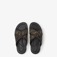 Sandals with crossed elastic bands. Leather base and rubber sole. Made of leather and rubber. The straps are customized with the brown and black macro FF motif. Made in Italy Composition: 65% polyamide, 35% cotton, decoration 1: 100% polyester, 100% lamb leather, inside: 100% lamb leather Product Code: 7X1548AJZEF0R7R