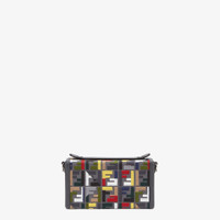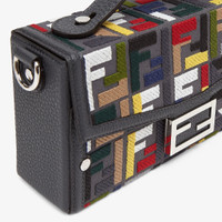 Baguette Soft Trunk bag, made of gray canvas with a raised iconic FF motif embroidered in multicolor yarn. Flap with magnetic FF clasp. Embellished with dark gray leather. Lined interior, leather pocket with six card holder slots and palladium-finish metalware. Technical fabric cross-body shoulder strap with FENDI lettering that is adjustable and detachable. Made in Italy Composition: 100% cotton, embroidery: 100% polyester, 100% calf leather, inside: 90% polyester, 10% polyurethane Product Code: 7VA565ATFSF11RG