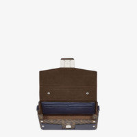 Soft Trunk Baguette Bag with dark blue full-grain leather panels superimposed on brown FF canvas. Flap with magnetic FF clasp. Lined interior, leather pocket with six card holder slots and palladium-finish metalware. The tech fabric cross-body shoulder strap with FENDI lettering is adjustable and detachable. Made in Italy Measurements: - Height : 13 cm - Depth : 6.5 cm - Width : 21.5 cm - Weight : 0.48 kg Composition: 100% calf leather, inside: 100% calf leather, 96% viscose, 4% acrylic Product Code: 7VA565AQWHF1O8P