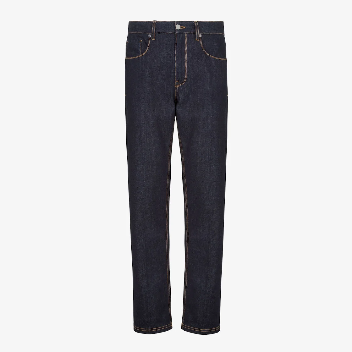Straight-cut five-pocket pants. Embellished with customized rivets and buttons. Concealed zipper closure. Width at the hem: 19.5 cm (7.8 inches). Made of dark blue denim fabric. Customized with contrasting stitching, tone-one-tone Selleria topstitching and FF logo embroidered on the right, back pocket. Embellished with metal logo rivets. Made in Italy Composition: 100% cotton Size worn: 48 IT. The model is 179 cm tall Product Code: FLP288AUAGF1RXI
