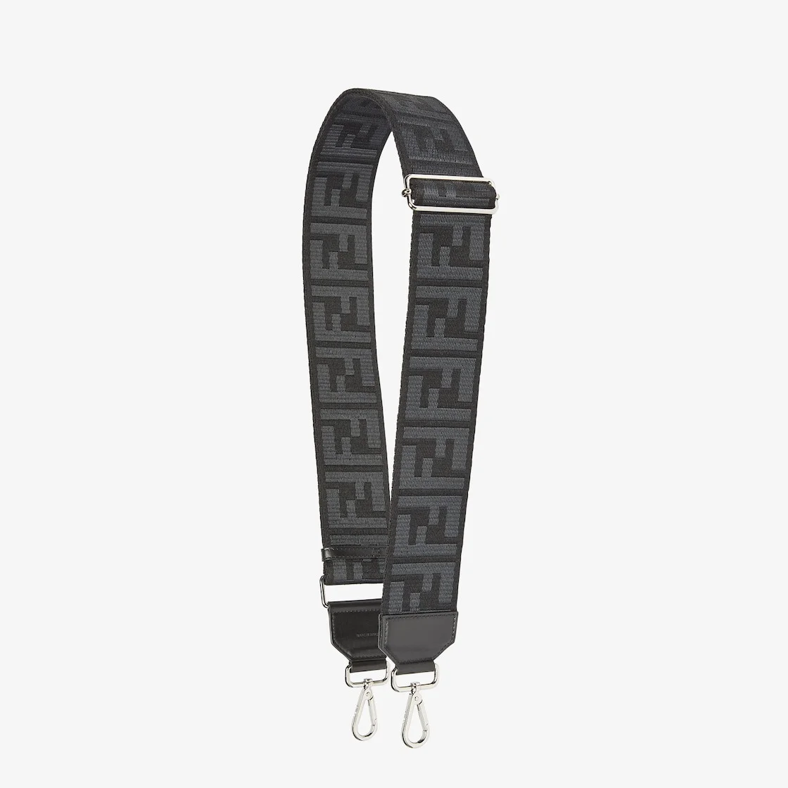 Long adjustable shoulder strap with double clip, to use in combination with any bag with hooks. Made of ribbon with a black and dark gray FF motif. Embellished with black leather details. Palladium-finish metalware. Made in Italy Composition: 100% polyester, 100% calf leather Product Code: 8AV439AMU7F1IKJ