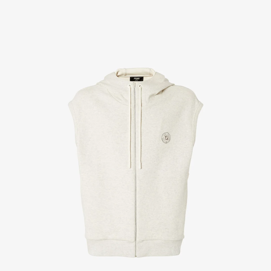 Oversized sleeveless sweatshirt. Sweatshirt with drawstring hood and pouch pocket on the front. Metal zip fastening. Made of light gray melange pure cotton. Embellished with a small contrasting FF Postcards logo embroidered on the chest, left-hand side. Made in Italy Composition: 85% cotton, 9% polyamide, 6% elastane, lining: 100% cotton, embroidery: 100% polyester Size worn: 48 IT. The model is 188 cm tall Product Code: FAF748AV67F1RVF
