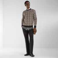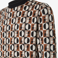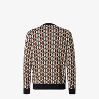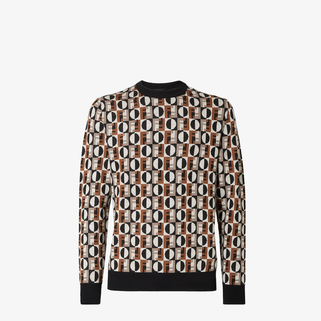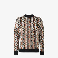 Regular-fit crew-neck pullover. Made of jacquard wool yarn with a three-dimensional Fendi Optical geometric motif in brown, white and black. Plain black ribbed edges. Made in Italy Composition: 100% wool, 1 button: mother-of-pearl Size worn: 48 IT. The model is 187 cm tall Product Code: FZX091AVNZF05AE