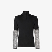 Long-sleeved polo neck jumper. Embellished with ribbed edges. Back zipper closure. Made of black wool yarn with all-over cable-knit motif. Featuring distinctive black lace inserts on the sleeves, creating a double layer effect, and on the collar with small buttons on the back. Made in Italy Composition: 100% fleece wool Size worn: 48 IT. The model is 188 cm tall Product Code: FZE067AOZOF0ABB