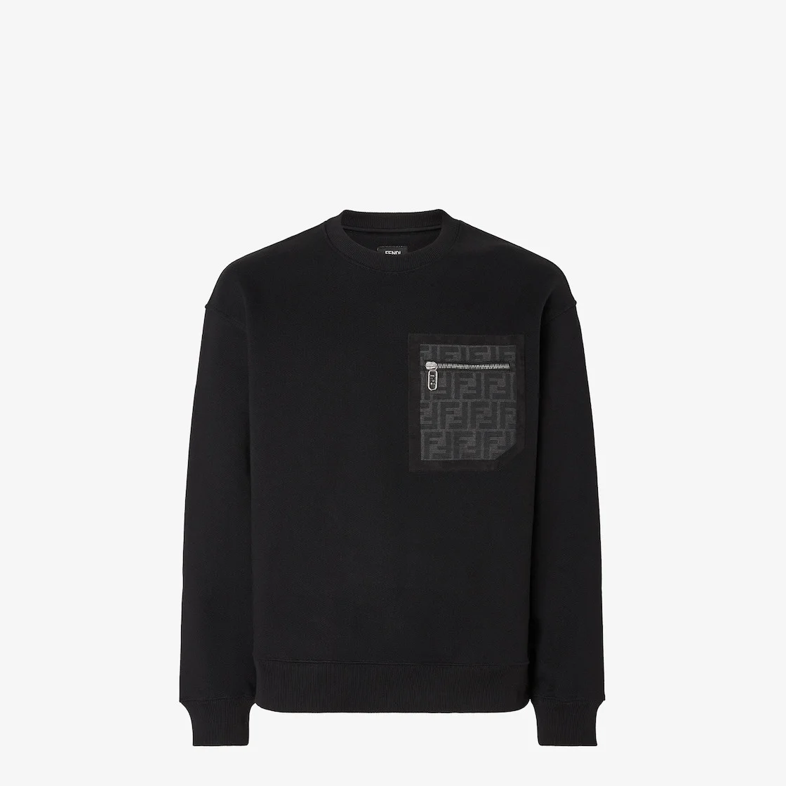 Long-sleeved crew-neck sweatshirt. Ribbed finish on neckline, cuffs and hem. Made from black cotton jersey. Embellished with leather patch pocket on the chest with FF motif. Made in Italy Composition: 100% cotton, buttons: 100% mother of pearl Fit: Over Size worn: 48 IT. The model is 186 cm tall Product Code: FY3938APN0F0QA1