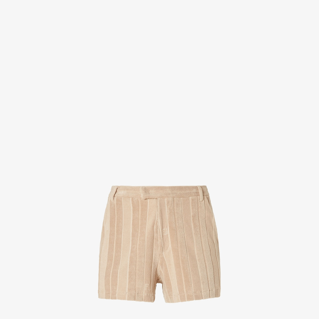 Swim trunks with side pockets and belt loops for a belt at the waist. Concealed zipper closure. Made of cotton terry with a vertical striped jacquard motif in beige. Finished with FF intarsia details. Made in Italy Composition: 80% cotton, 20% polyamide, 80% cotton, 20% polyamide, 1 button: mother-of-pearl Size worn: 48 IT. The model is 186 cm tall Product Code: FB0472AV0OF0UAT