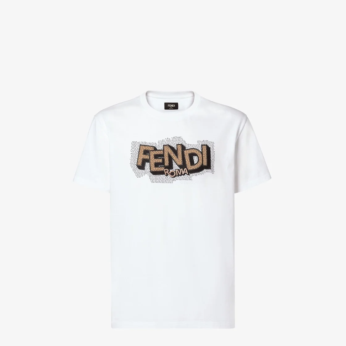 Slim-fit short-sleeved crew-neck T-shirt. Made of 100% cotton in white. Embellished with a Fendi Pop Pois motif embroidered on the front, inspired by the collection’s Falena Dots pattern. Made in Italy Composition: 100% cotton Product Code: FY1319AW0WF0QA0
