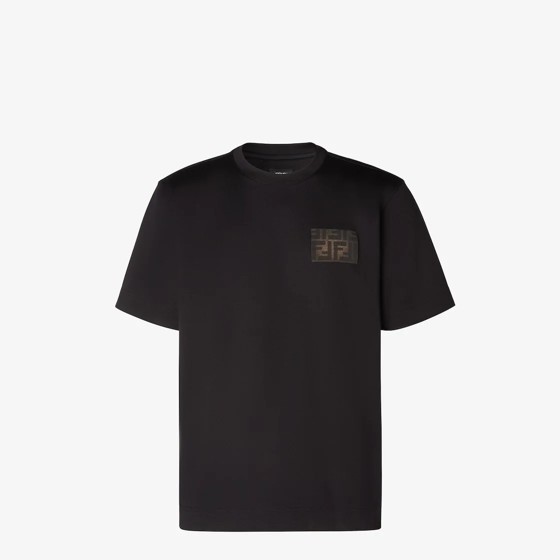 Short-sleeved crew-neck oversized T-shirt. Made from black cotton jersey. Decorated with a canvas patch featuring the FF Eclissi motif on the chest in shades of brown and black with a gradient effect. Made in Italy Composition: 100% cotton, buttons: 100% mother-of-pearl Fit: Over Size worn: 48 IT. The model is 185 cm tall Product Code: FY0936AQJAF0QA1