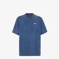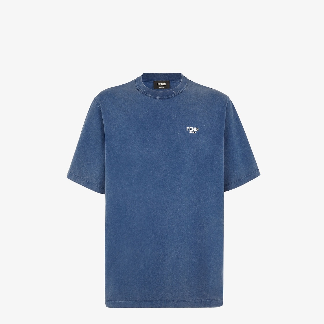 Regular-fit short-sleeved crew-neck T-shirt. Made of blue washed, pure cotton. Finished with palladium-finish metal Fendi Roma lettering on the chest. Made in Italy Composition: 100% cotton, buttons: 100% mother of pearl Size worn: 48 IT. The model is 189 cm tall Product Code: FY1217APMEF0QC7