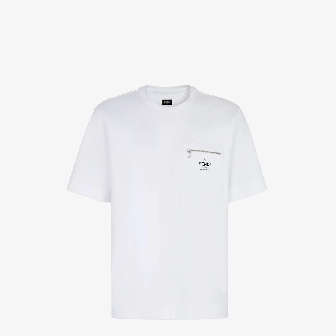 Short-sleeved, crew-neck, oversized T-shirt. Made of 100% cotton in white. The breast pocket is embellished with a small printed Fendi Roma label and zipper with a Fendi O'Lock slider. Made in Italy Composition: 100% cotton, 1 button: mother of pearl Product Code: FY0936ARYRF0QA0