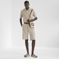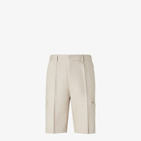 Straight-cut Bermuda shorts with small double-welt pocket on the leg. Belt loops on the waistband and trouser crease. Concealed zipper and hook closure. Made of beige linen. Customized with a button-effect palladium-finish metal micro FF logo applied at the waist. Made in Italy Composition: 95% linen, 5% elastane, lining: 65% polyester, 35% cotton, 1 button: mother-of-pearl Size worn: 48 IT. The model is 186 cm tall Product Code: FB1061AUVEF0Y19