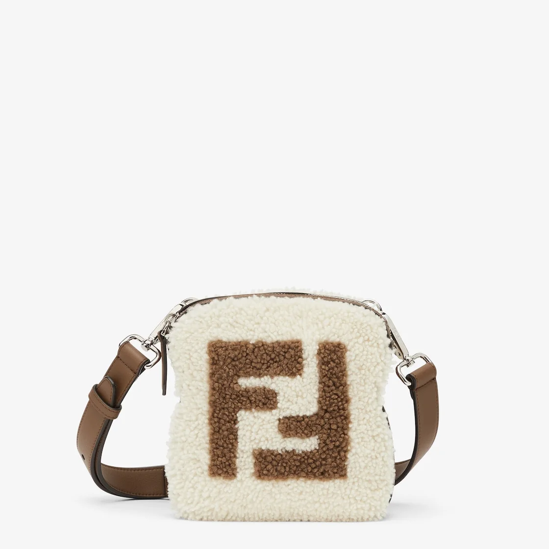 Toast-shaped mini-bag with zipper. The bag can be worn on the shoulder thanks to the adjustable, detachable shoulder strap. Made of white shearling with brown FF inlay. Brown leather details. Palladium-finish metalware. Made in Italy Composition: 100% sheep fur, 100% calfskin, inside: 63% cotton, 34% polyester, 3% acrylic Product Code: 7AS311ASLCF1QC1