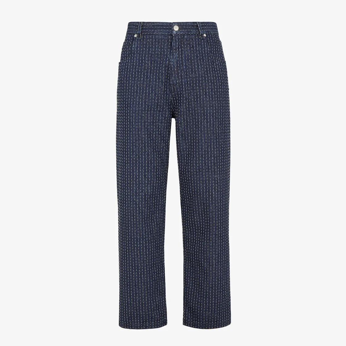 Straight-cut, regular-fit, five-pocket pants. Embellished with customized rivets and buttons. Concealed zipper closure. Width at the hem: 22 cm (8.7 inches). Made of a blue denim fabric with all-over beige jacquard topstitching. Embellished with leather strap at the back with tone-on-tone embroidered Fendi Roma lettering. Made in Italy Composition: 93%cotton, 6%polyamide, 1%elastane Size worn: 48 IT. The model is 186 cm tall Product Code: FLP285AUACF1RXI