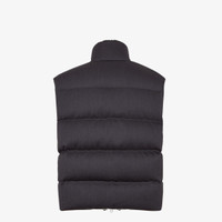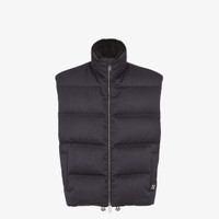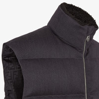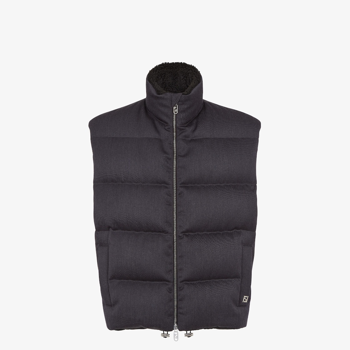 Padded gilet with high collar and drawstring hem. Welt pockets on the sides. Zipper closure with double slider. Made of black wool twill with horizontal striped quilted motif. Matching tone FF jacquard lining and inner collar in black sheepskin. Embellished with metal FF logo applique on the left side pocket. Palladium-finish metalware. Made in Italy Composition: 100% fleece wool, lining: 100% viscose, padding: 100% duck feathers, 100% goose feathers Size worn: 48 IT. The model is 189 cm tall Product Code: FT0079ATE3F0TY3