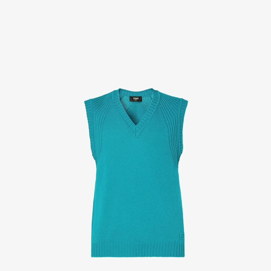 Regular fit V-neck gilet. Ribbed edges. Made of turquoise cashmere yarn, crafted in a knit that sculpts the raglan cut and sides. Embellished with an embossed micro FF logo on the hem, left side. Made in Italy Composition: 100% wool Product Code: FZE075AW0JF0XCN