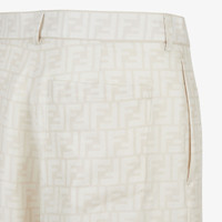 Bermuda shorts with elasticated waist at the sides. Concealed zipper closure. Width at the hem: 32.5 cm. Made of silk with an all-over FF print in white. Lined. Made in Italy Composition: 100% silk, fabric inner lining: 100% cupro Size worn: 48 IT. The model is 188 cm tall Product Code: FB1014AKEEF1H48
