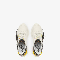 Slip-on sneakers with elasticated laces, side zip and corrugated sole with engraved F. Fendi Flow lettering embossed on the heels. Made of white leather with FF jacquard fabric details. Embellished with a Lycra® tongue with FF motif. Sole in lightweight white rubber with black diagonal F detail. Made in Italy Composition: 100% Calfskin, 65% Polyamide, 35% Cotton, interior: 100% Polyester Product Code: 7E1392AJZHF1HGR