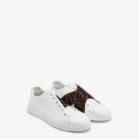 Slip-on sneakers with crisscrossing elastic straps. Made of whitecalfskin. Tone-on-tone Romano leather tongue. Elastic straps with FF motif in shades of black and tobacco. Rubber box sole. Made in Italy Composition: 100%CALF LEATHER,Inside:100%LAMB LEATHER,100%POLYESTER,Embroidery:55%POLYESTER,45%POLYAMIDE,100%RUBB