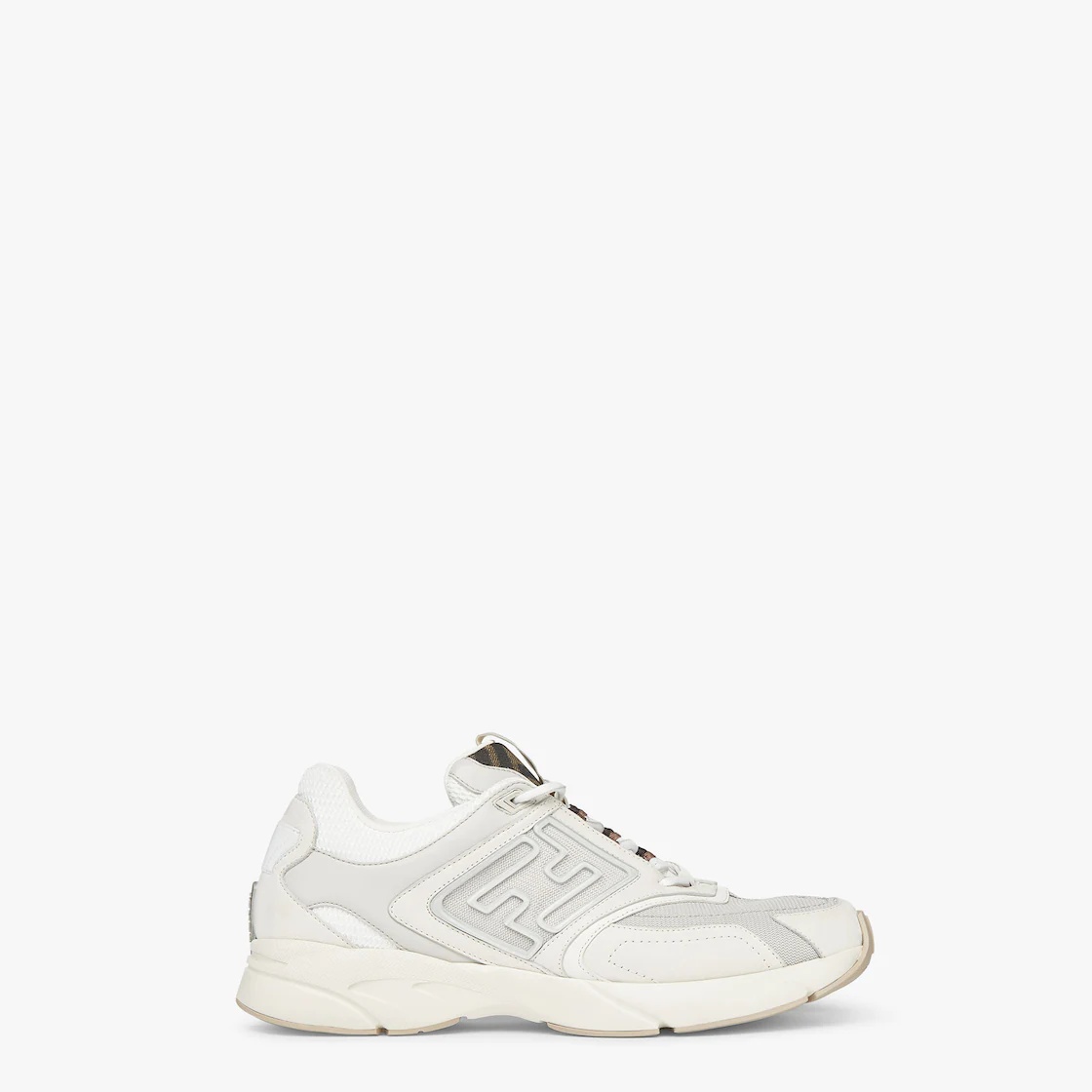 Fendi Faster sneakers made of white nubuck leather with matching leather and technical fabric details and embossed FF motif on the sides. Corrugated running soles with FF on the toes. Embellished with FF fabric inserts in brown and tobacco. Made in Italy Composition: : 100% Calfskin, 100% Polyester, 100% Cotton, 65% Polyamide, 35% Cotton, interior: 100% Polyamide, 100% Polyester Model height: 187 cm Size worn: null Product Code: 7E1555AKX6F1ICF