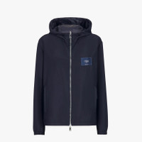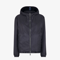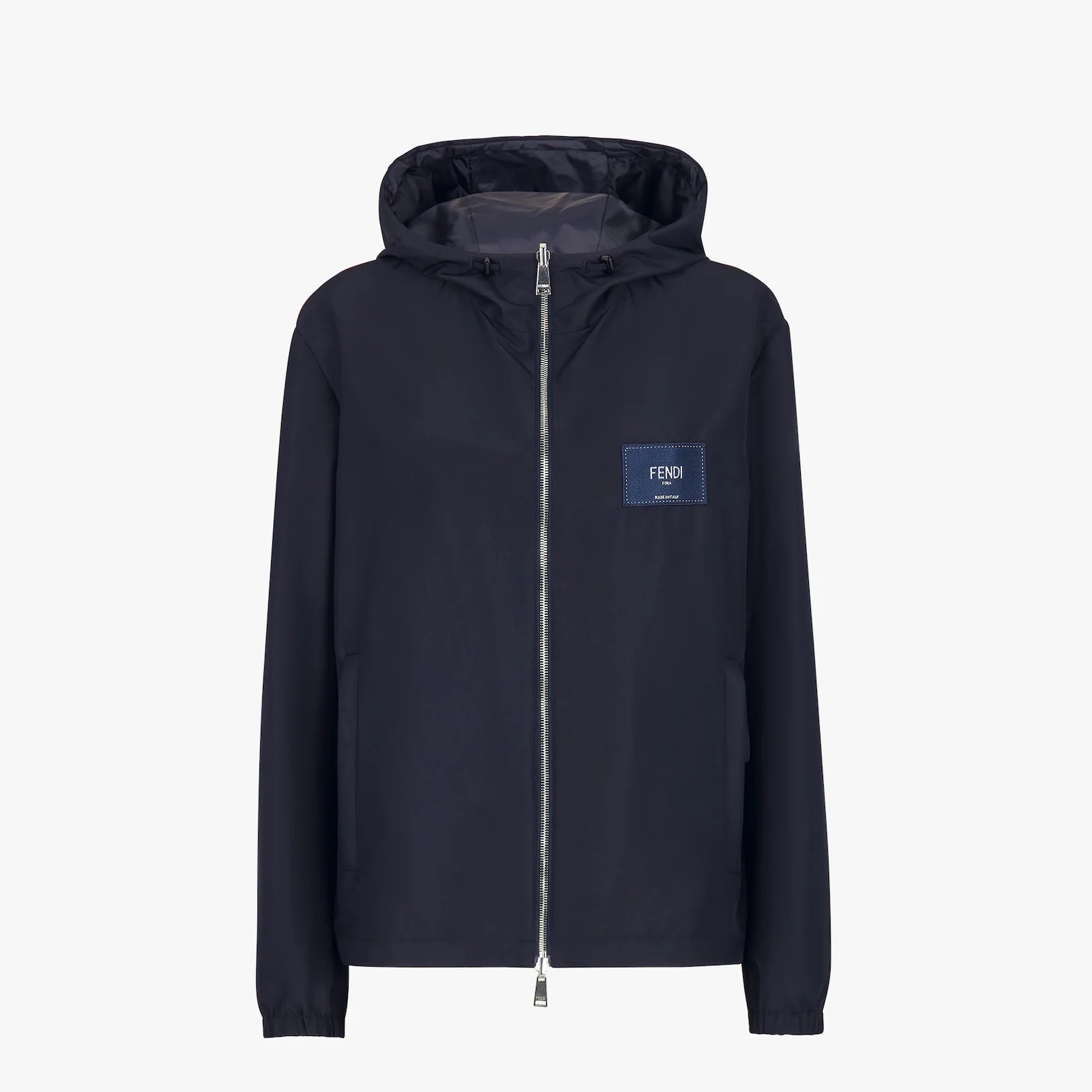 Reversible windbreaker with drawstring hood and hem. Side pockets and stretch cuffs. Zip fastening. The item can be folded into the matching pouch. Made of dark blue nylon. Branded with the Fendi embroidered jacquard label on the chest. Made in Italy Composition: 100% Polyester, fabric inner lining: 100% Polyester Size worn: 48 IT. The model is 186 cm tall Product Code: FW1088A9RSF03LQ
