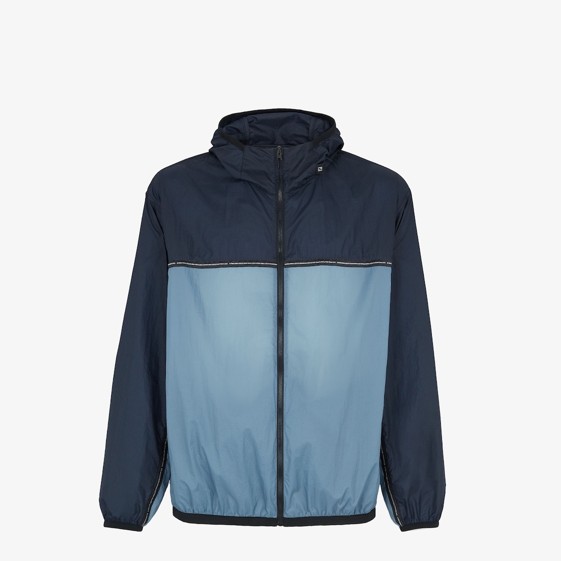 Windbreaker with hood and side zip pockets. Oversized fit. Fendi logo ribbon elasticated edges. Made of blue and light blue color-block nylon. The sleeves and yoke are trimmed with black Fendi Roma 1925 ribbon piping, the hood has a small square FF label on the side. Made in Italy Composition: 100% polyamide Size worn: 48 IT. The model is 187 cm tall Product Code: FAA925AR52F1NUI