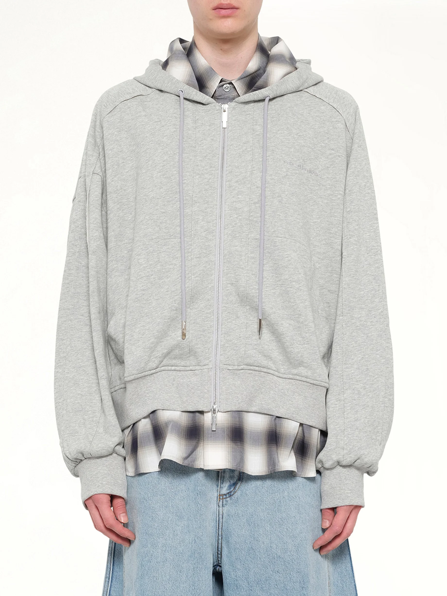 Feng Chen Wang's 2 in 1 Zip Hoodie with Check in Grey is a versatile and stylish addition to any wardrobe. This innovative design combines functionality with a modern aesthetic, perfect for layering or wearing on its own. - Composition: A:100% Cotton B:70% Polyester, 30% Rayon - Features a unique 2 in 1 design with detachable elements - Stylish check pattern in a neutral grey color - Full zip closure for easy wear - Adjustable drawstring hood for added comfort - Multiple pockets for convenient storage - Made in China Model is 187 cm and wears size M SKU: FUS21HD02B