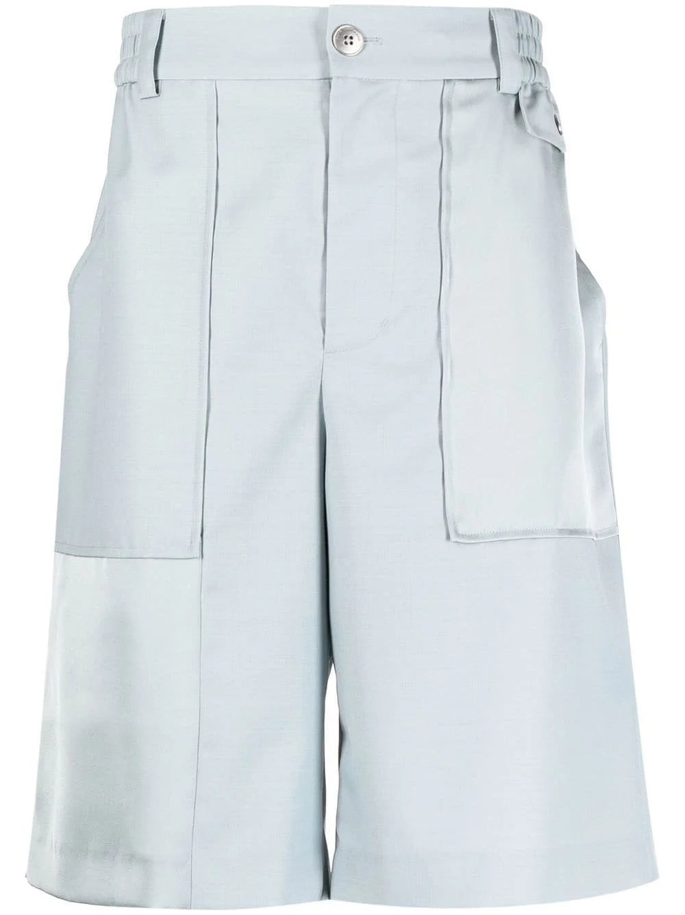 above knee bermuda shorts grey two front patch pockets two rear flap pockets elasticated waistband front zip fastening above-knee length Imported Composition Body: Polyester 50%, Wool 50% SIZE & FIT Model measurements Height 6 ft 2 in(1.87 m) Bust/Chest 36.22 in(92 cm) Hips 37.79 in(96 cm) Waist 28.34 in(72 cm) FittingInformation This piece fits true to size. We recommend you get your regular size Designed for a slim fit at the waist and loose over the leg Made with a mid-weight non-stretch fabric