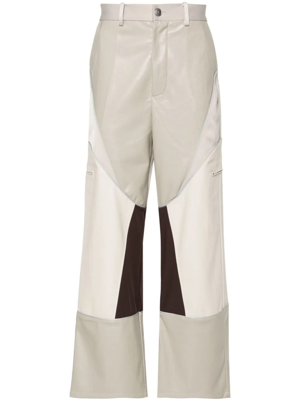panelled straight-leg cargo pants Highlights - Ecru/light grey/black - Faux leather - Panelled design - Contrasting border - Belt loops - Two side slash pockets - Two zip-fastening pockets - Two rear welt pockets - Straight leg - Front button and zip fastening Imported Composition Outer: Polyester 100% Lining: Polyester 100% SIZE & FIT Model measurements Height 6 ft 1 in(1.86 m) Bust/Chest 37.4 in(95 cm) Hips 36.22 in(92 cm) Waist 29.52 in(75 cm) FittingInformation Designed for a straight-leg, allowing for an unrestricted and comfortable fit over the leg Made from a midweight non-stretch fabric, this piece offers minimal elasticity when worn This piece fits true to size – take your usual size Washing instructions Do Not Wash/Do Not Dry Clean