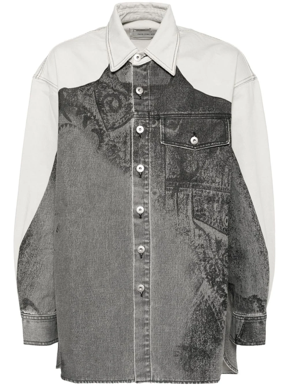 printed denim jacket Highlights - Black/grey - Cotton - Trompe l'oeil print - Embroidered logo at the chest - Contrast stitching - Drop shoulder - Chest flap pocket - Buttoned cuffs - High-low hem - Front button fastening Imported Composition Cotton 100% SIZE & FIT Model measurements Height 6 ft 2 in(1.87 m) Bust/Chest 33.07 in(84 cm) Hips 35.43 in(90 cm) Waist 26.77 in(68 cm) FittingInformation Designed to be unstructured, offering a loose fit throughout Sturdy and hard-wearing, this denim piece offers no stretch Washing instructions Hand Wash