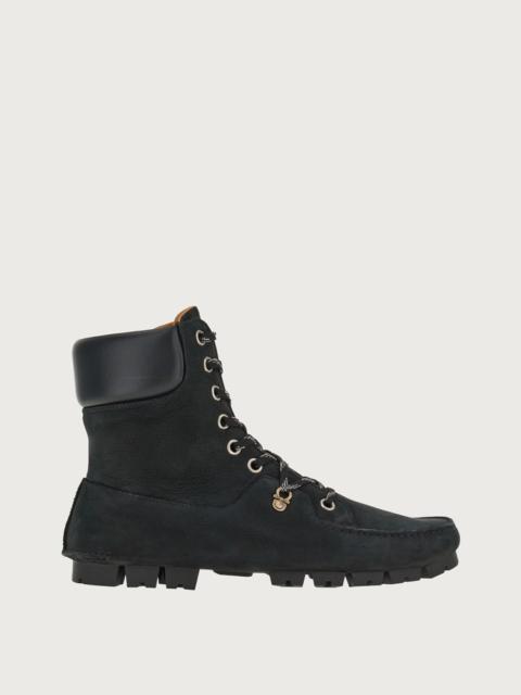 The softest nubuck is cut and sewn to create this new off duty ankle boot by Ferragamo. The informal lines of the upper feature raised stitching that echoes the outline of the 90’s Wallabee, with tubular laces and unique loop eyelets. The sole is inspired by the driver moccasin, revised in an urban key. The upper is stitched by hand as part of an artisanal process known as “Tubular”, an exclusive method used only by experts to ensure a supple and light finish. - Composition: nubuck - Made In ITALY