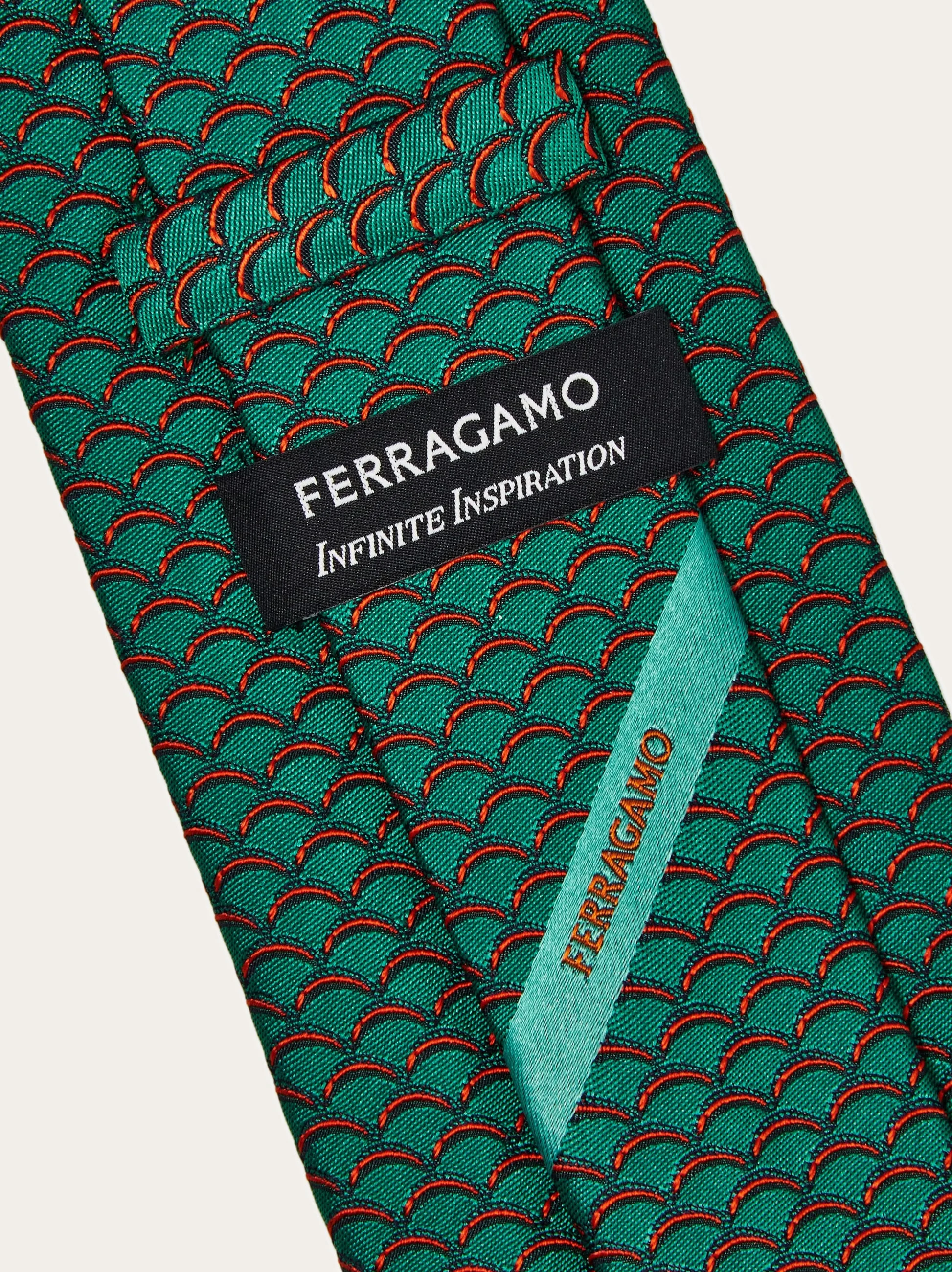 Pure silk tie with a geometric jacquard texture, a refined accessory that elevates formal looks. The delicate interplay of contrasting tones adds vibrancy and sophistication. Inspired by a 1936 Ferragamo archival print, the design evokes a fish-skin effect through a three-dimensional pattern with sculptural appeal. Originally conceived to embellish women’s shoes, these inspirations are now reimagined as textile motifs, transformed into jacquard with the same expressive intensity. - Composition: 100% silk - Made in ITALY - Product code: 351401 792628
