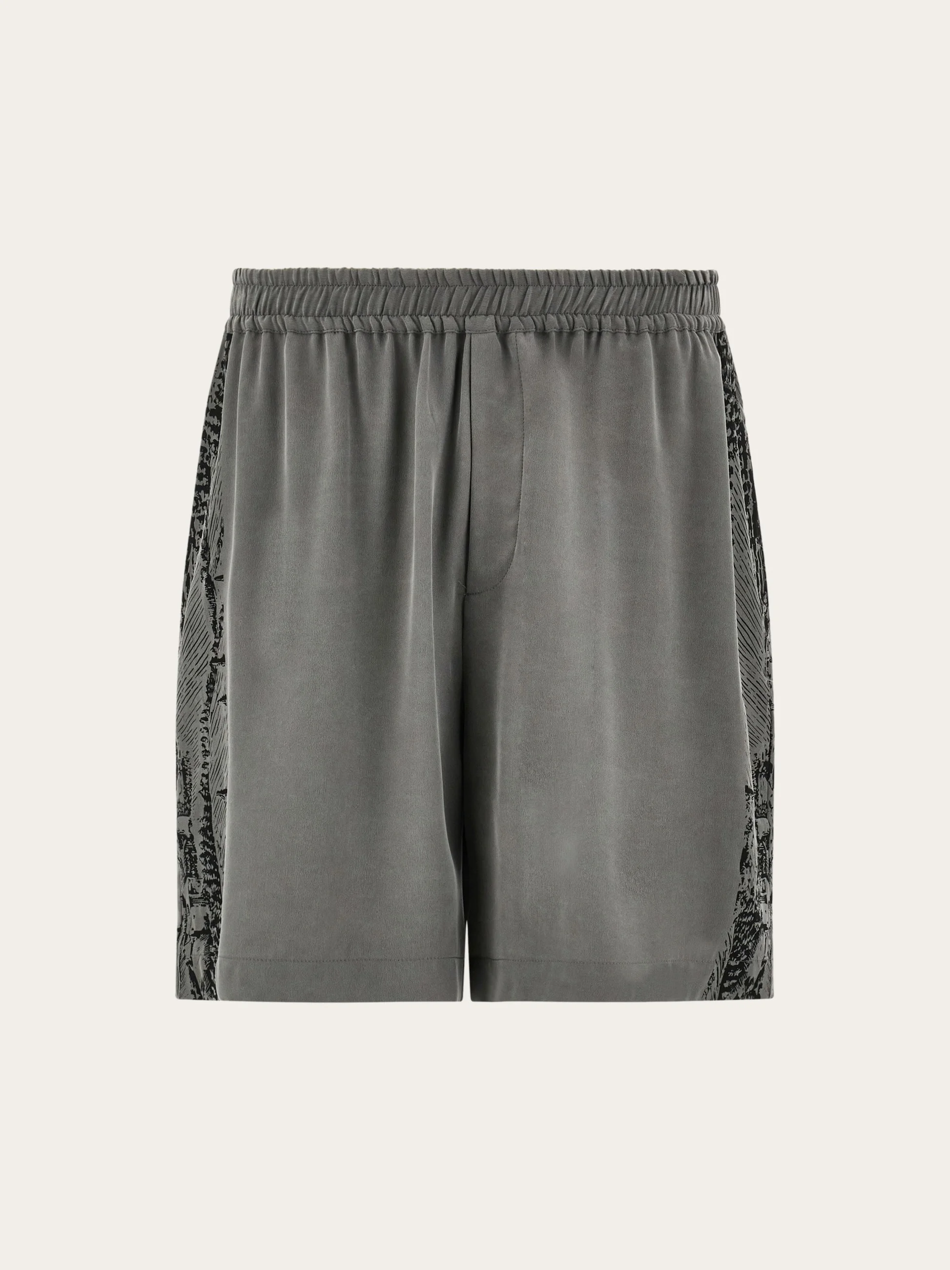 Cut from the softest silk with a brushed texture, these Bermuda shorts have a stylish look and a sustainable heart. The feel is relaxed, with a drawstring waist extracts of a Tuscan landscape printed along the leg. The lithograph-inspired motif is created with FSC certified biobased pigment. - Composition: 100% silk - Made in ITALY - Product code: 144890 786954